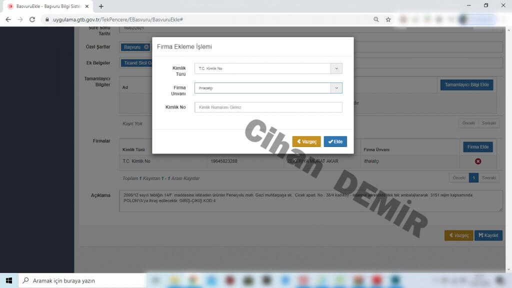 Bu seçeneklerde belirlenen üç firma aynı olsa dahi ithalatçı , ihracatçı ve izin sahibi tek tek eklenmelidir.